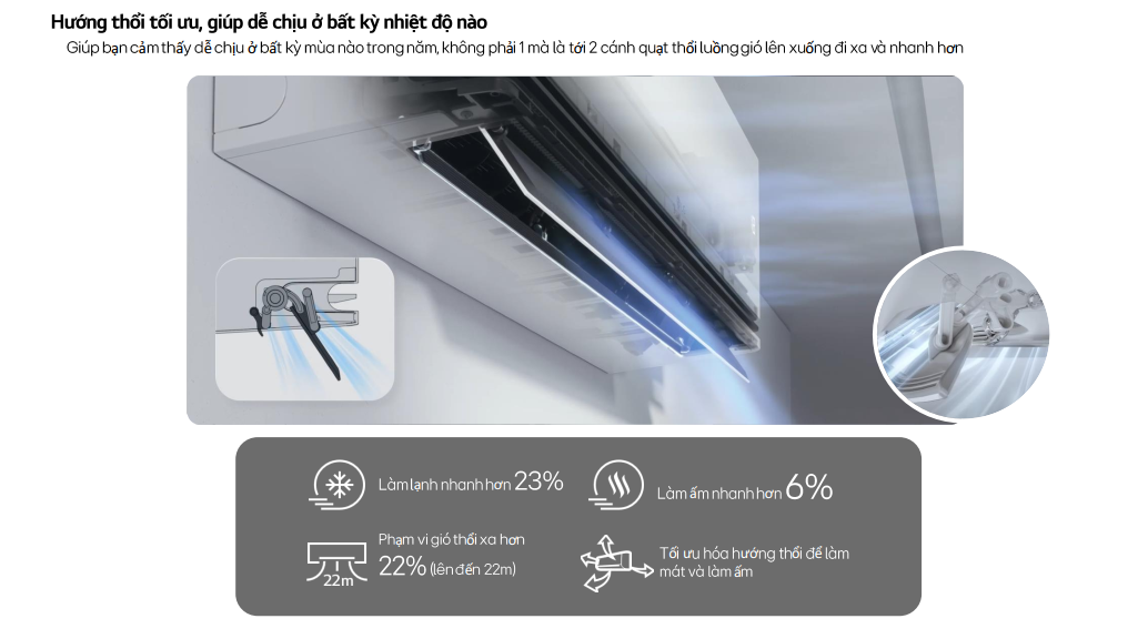 Sự cải tiến trong thiết kế ống thổi, Máy lạnh LG 12000 BTU Inverter – IDC12M1 với ống thổi Dual Vane giúp tối ưu hoá hướng thổi và làm lạnh nhanh hơn 23% đem lại một cảm giác dễ chịu ở bất kỳ nhiệt độ nào.