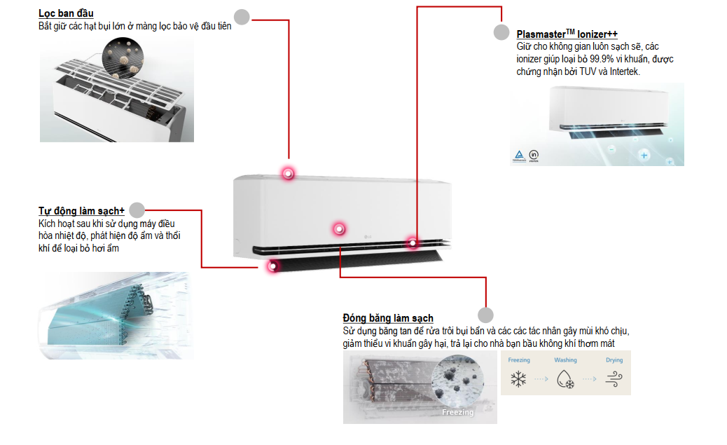 Trải qua 4 bước lọc khí toàn diện giúp lọc sạch bụi bẩn và các tác nhân gây hại trả lại cho căn phòng bầu không khí thơm mát mà vẫn giữ được độ ẩm. Máy lạnh LG 12000 BTU Inverter – IDC12M1 kết hợp cùng công nghệ lọc khí Ion Plasmaster Ionizer được TUV và Invertek chứng nhận, giữ cho không gian luôn sạch sẽ và loại bỏ 99,9% vi khuẩn.