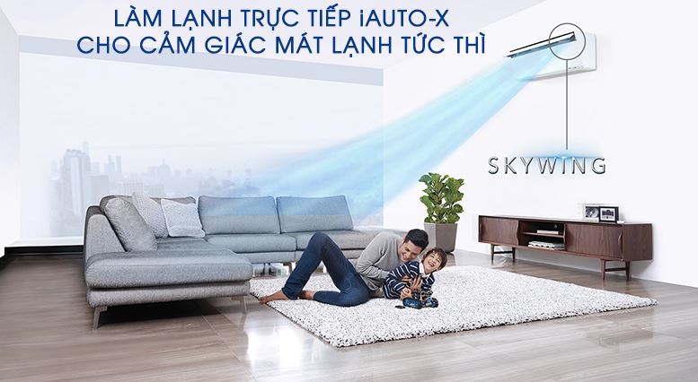 Có thiết kế cánh đảo gió theo dạng Skywing, miệng cánh hướng lên phía trên giúp hướng luồng gió thổi lên trần nhà. Luồng không khí lạnh sẽ chạy dọc trên bề mặt trần và tường, rồi tỏa vào không gian, tránh thổi trực tiếp vào người. Tạo cảm giác mát lạnh cực dịu êm, đặc biệt tốt cho làn da nhạy cảm của trẻ nhỏ.