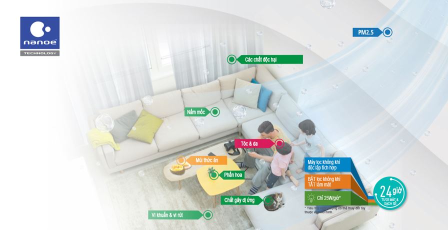 Các hạt nanoe™X gốc nước có thể làm giảm mùi hôi đậm và ngăn chặn các chất ô nhiễm có hại như vi khuẩn và vi-rút, nấm mốc, chất gây dị ứng, phấn hoa và các chất độc hại. Các hạt nanoe™ X thậm chí còn có thể giữ ẩm cho da và tóc. nanoe-G có các ion âm có thể loại bỏ hiệu quả các hạt bụi nhỏ như PM2.5.
