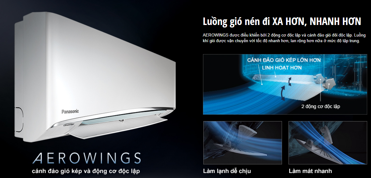 Khi bắt đầu, AEROWINGS nghiêng xuống và tập trung làm mát trực tiếp để giảm nhiệt ngay lập tức. Cánh đảo gió kếp và động cơ độc lập giúp luồng gió đi xa và nhanh hơn.