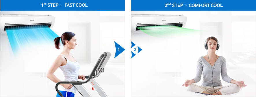 Máy điều hòa Samsung làm lạnh theo 2 bước. Đầu tiên, máy sẽ làm lạnh tức thì với chế độ Làm Lạnh Nhanh. Sau đó, máy sẽ tự động điều chỉnh sang chế độ Làm Lạnh Thoải Mái để duy trì nhiệt độ mong muốn, để bạn không bị lạnh và luôn cảm thấy dễ chịu.
