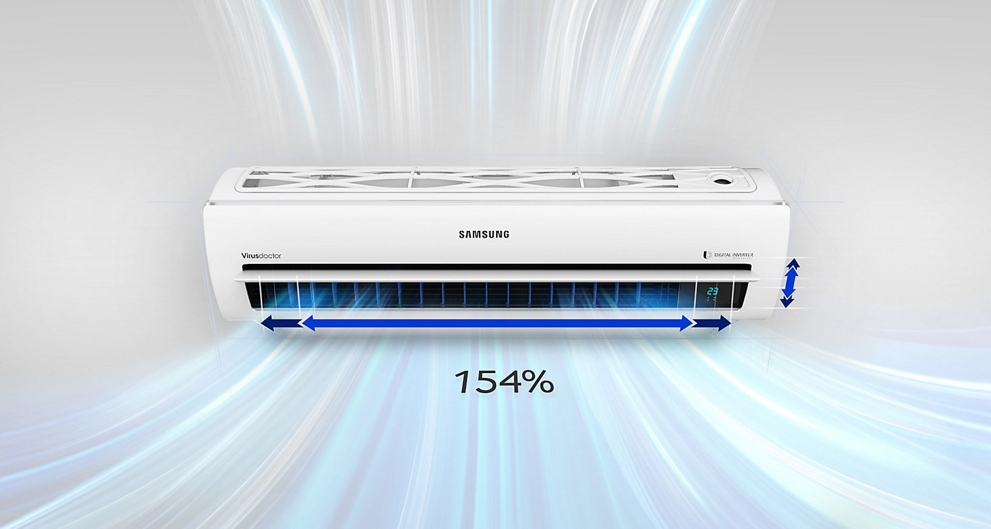 Công nghệ Digital Inverter Máy Nén 8 cực mới của máy điều hòa Samsung giúp máy vận hành với hiệu quả vượt trội, làm lạnh tức thì, tiết kiệm điện năng tiêu thụ và hạn chế tiếng ồn. Ngoài ra, thiết kế tam diện độc đáo với miệng hút khí và các góc của miệng thổi khí rộng hơn, cùng với quạt gió lớn hơn giúp làm lạnh nhanh hơn, xa hơn và lan tỏa đều khắp phòng – để bạn tận hưởng không khí trong lành thoải mái dù ở bất cứ nơi đâu.