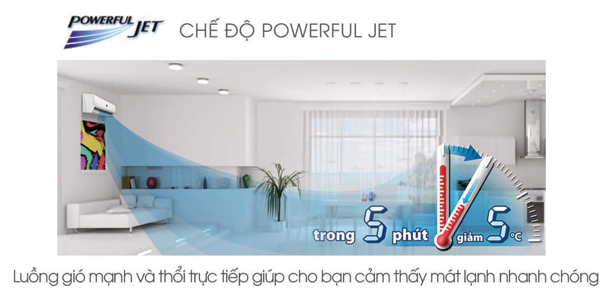 Chế độ Powerful Jet tạo ra lưu lượng và tốc độ không khí cao hơn, giúp căn phòng nhanh chóng đạt đến nhiệt độ cài đặt. Bạn không cần phải chờ đợi lâu hơn khi muốn thư giãn, luồn gió mát lạnh và sảng khoái sẽ mang đến cho bạn cảm giác khoan khoái dễ chịu.