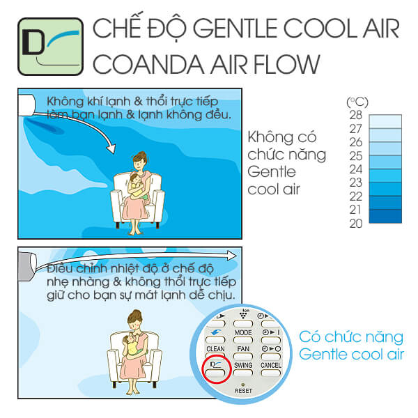 Luồng gió dịu êm cho giấc ngủ say nồng. Chế độ Gentle Cool Air thổi không khí lạnh hướng lên trần nhà thay vì hướng xuống đất, nơi có các em bé, phụ nữ mang thai, người già, hay những người có cơ thể không chịu được không khí quá lạnh. Chế độ gió này sẽ đem đến cho bạn những đêm ngon giấc, khi luồng gió nhẹ dỗ dành đưa bạn vào giấc ngủ, và không đánh thức bạn lúc nửa đêm.