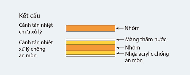 Để nâng cao độ bền bằng cách cải thiện khả năng chịu đựng ăn mòn do muối và ô nhiễm không khí, dàn trao đổi nhiệt được xử lý chống ăn mòn (đã được xử lý sơ bộ bằng acryl) được sử dụng cho dàn trao đổi nhiệt tại dàn nóng.